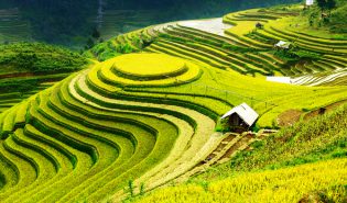 Depending on the time of year, the colors of rice terraces in Mu Cang Chai vary from emerald green in late spring and summer to golden yellow in October when the rice ripens. Photo...